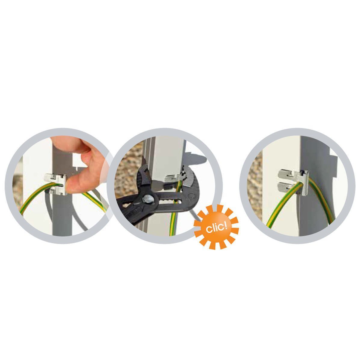 Vous n'avez qu'à faire passer le câble PE de 6mm² au centre du clip puis à encastrer ce dernier sur le cadre de votre panneau à l'aide d'une pince multiprise et le tour est joué.
