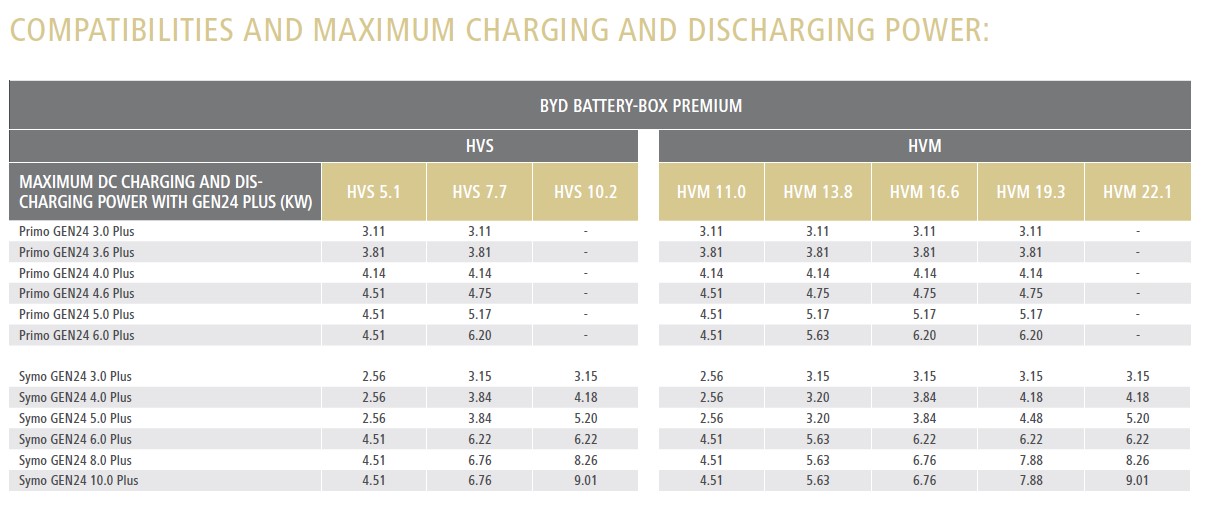 Compatibilité des batteries BYD avec les onduleurs hybrides GEN24 et différence de puissance de charge et décharge entre HVS et HVM selon association onduleur