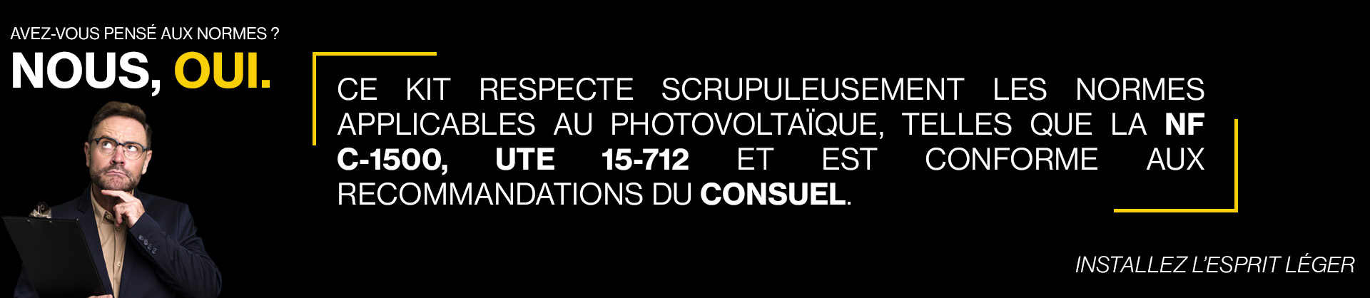 Ce kit en autoconsommation répond aux exigences de la norme UTE 15-712-3 avec ajout d'un coffret AC type B et permet une validation par le Consuel