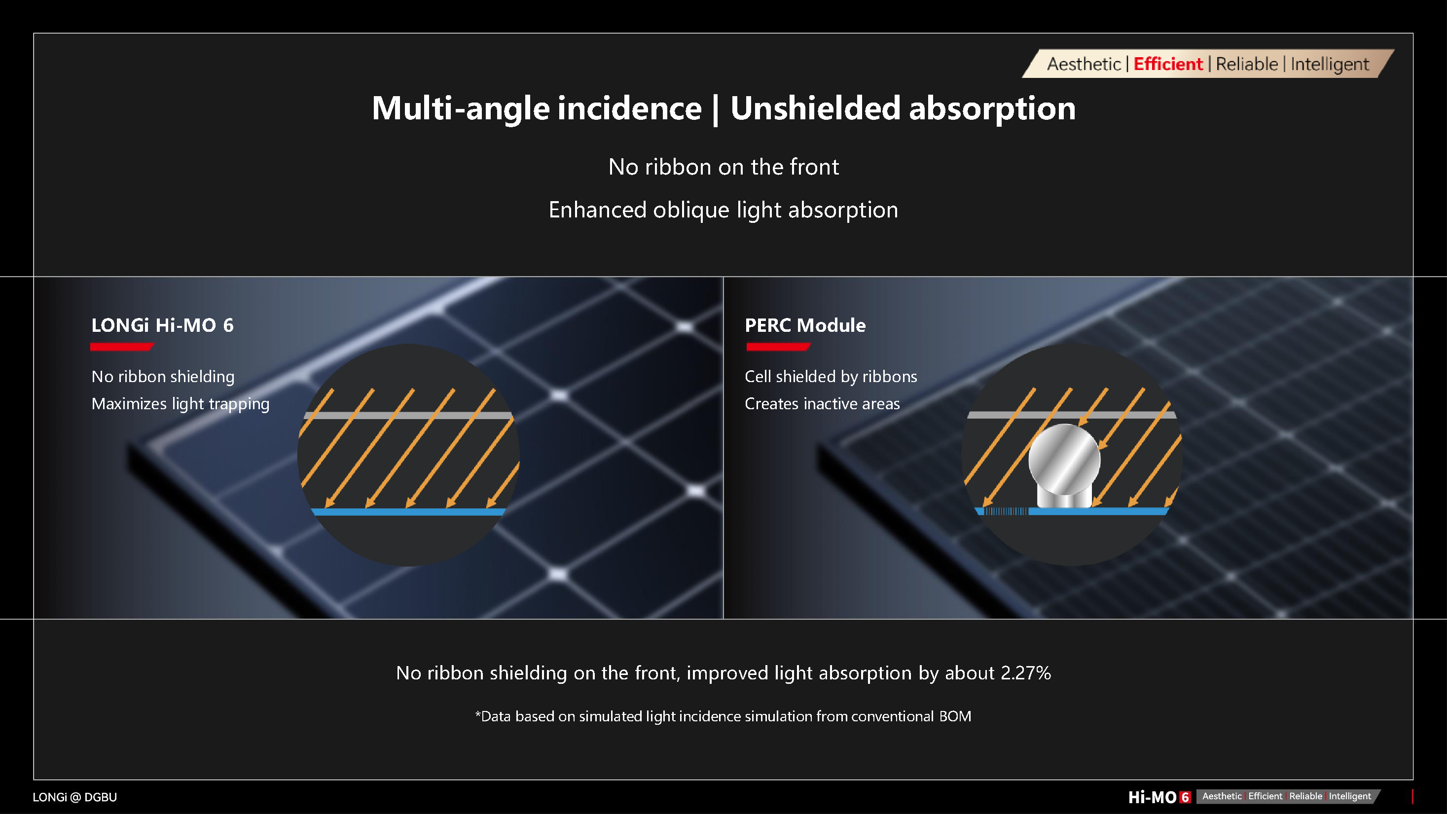 Cette gamme de panneaux solaires LONGI Solar Hi-MO X6 de la série Explorer est particulièrement performante en basse lumière grâce à la technologie back contact déjà largement éprouvée. Les performances du module solaire sont aussi améliorées grâce au coefficient de température nettement plus performant que beaucoup de ses concurrents lui permettant de réaliser un gain de puissance et énergétique lorsque les températures deviennent particulièrement élevées.