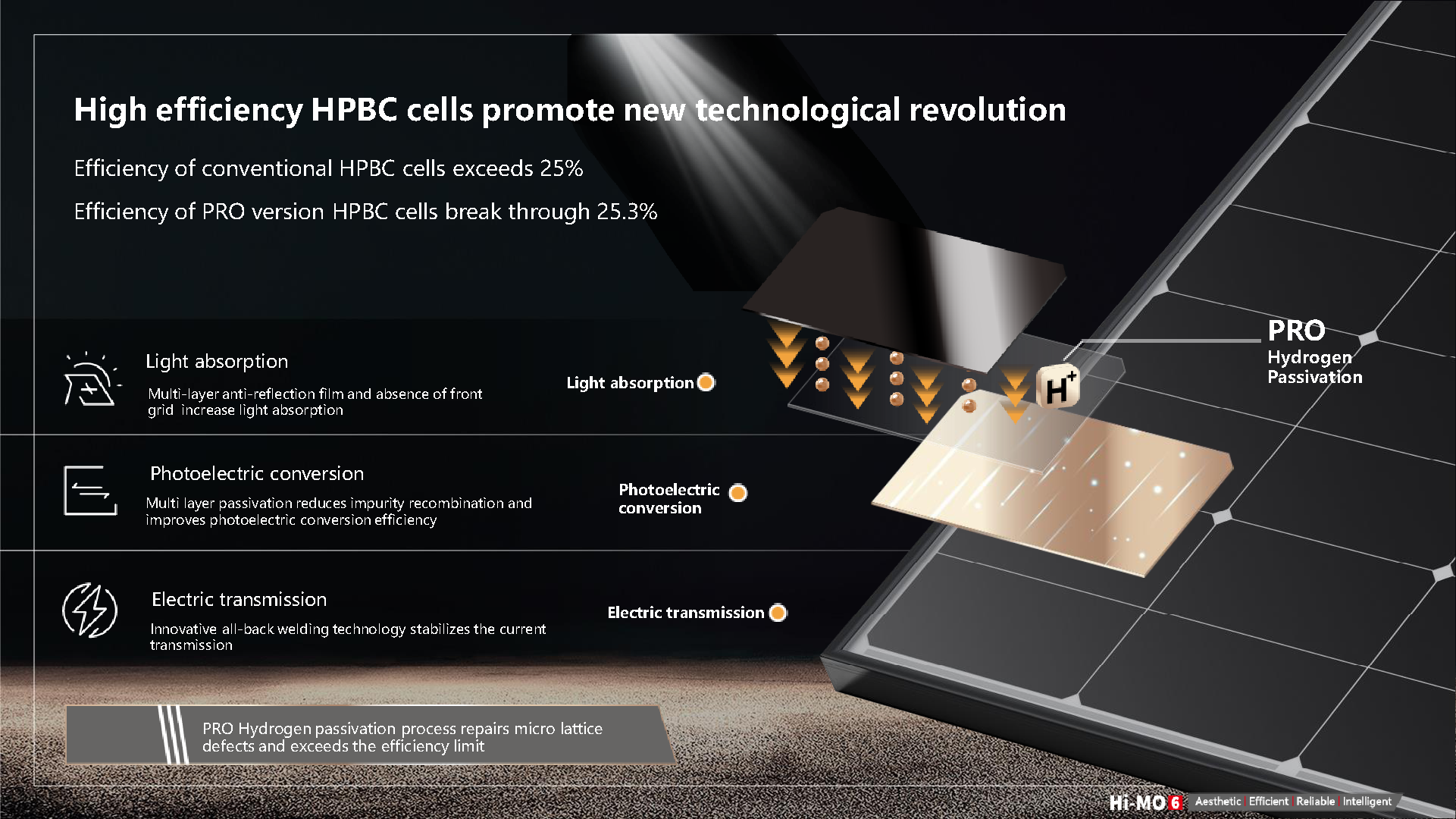 HPBC est l'acronyme de Hybrid Passivated Back Contact cell (cellule hybride à contact arrière passivé), sa face avant étant dépourvue de jeu de barres et de ruban, contribuant ainsi à l'efficacité, à la durabilité et à l'esthétique du module.